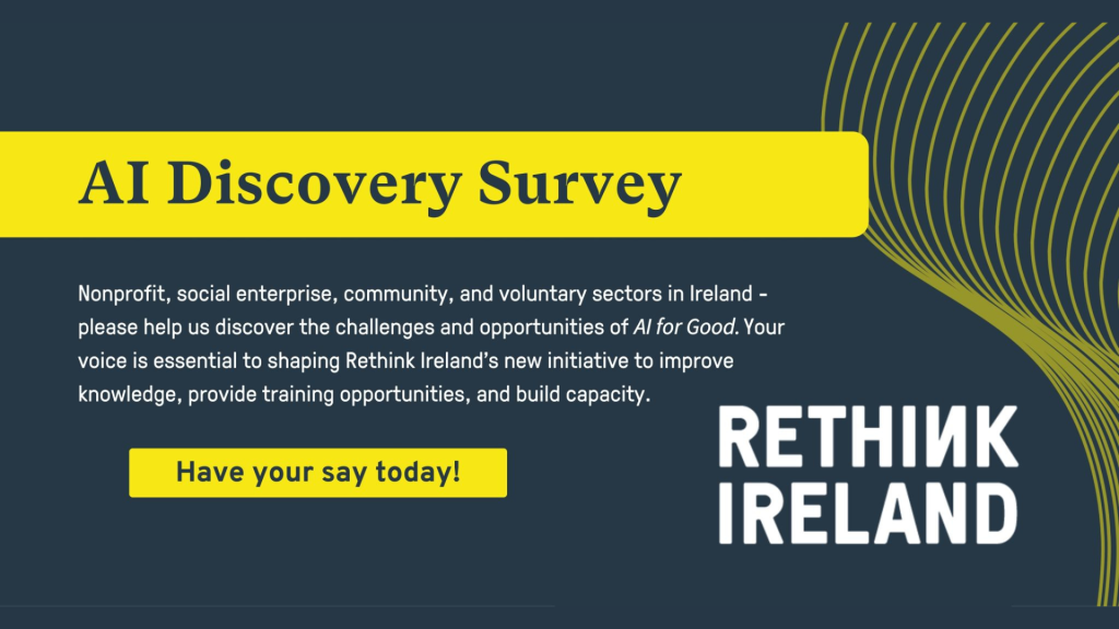 Rethink Ireland invites workers and volunteers to complete a short (5-minute) AI Discovery Survey, open until 15 April, to help shape how AI can be used in ethical, inclusive and impactful ways across organisations. Available in both English and Irish, the survey aims to identify priority needs and emerging trends, informing the development of future supports and resources. Participants will also have the opportunity to register interest in upcoming Discovery Days — a series of free AI learning workshops taking place nationwide in 2026. Organisations are encouraged to share the survey widely to ensure diverse input and maximise its impact. Survey in English | Survey in Irish